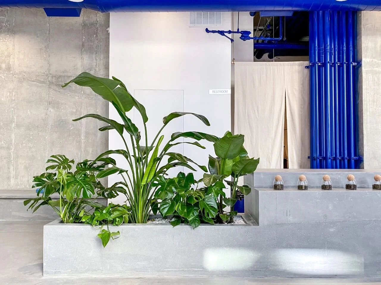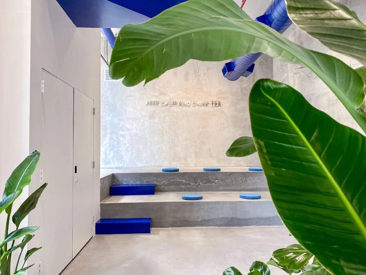 Exposed concrete, open ceilings, and visible mechanical systems establish an honest industrial character, while a bold blue infrastructure line becomes a defining visual signature throughout the interior.